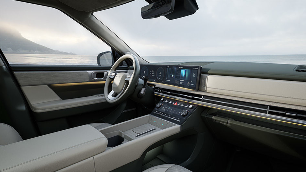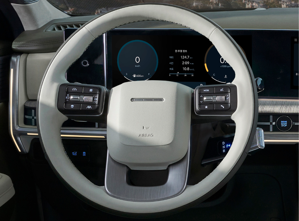그랜저에서 처음 등장한 디자인의 핸들인 듯하지만 아래쪽 부분에 스포크가 하나 더 들어가 있고, 12.3인치 디지털 계기판과 12.3인치 인포테인먼트 시스템이 하나로 연결된 파노라믹 커브드 디스플레이가 적용되었습니다. 또한 눈에 띄는 점은 스마트폰 무선 충전 패드가 2대가 마련되어 있다는 점. 그리고 기어 노브가 있어야 할 곳에 보이지 않는 걸로 보아 컬럼식 기어를 채택하여 센터 트레이의 수납성을 향상시킨 것으로 보입니다.